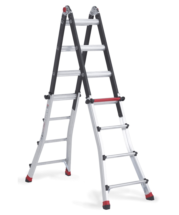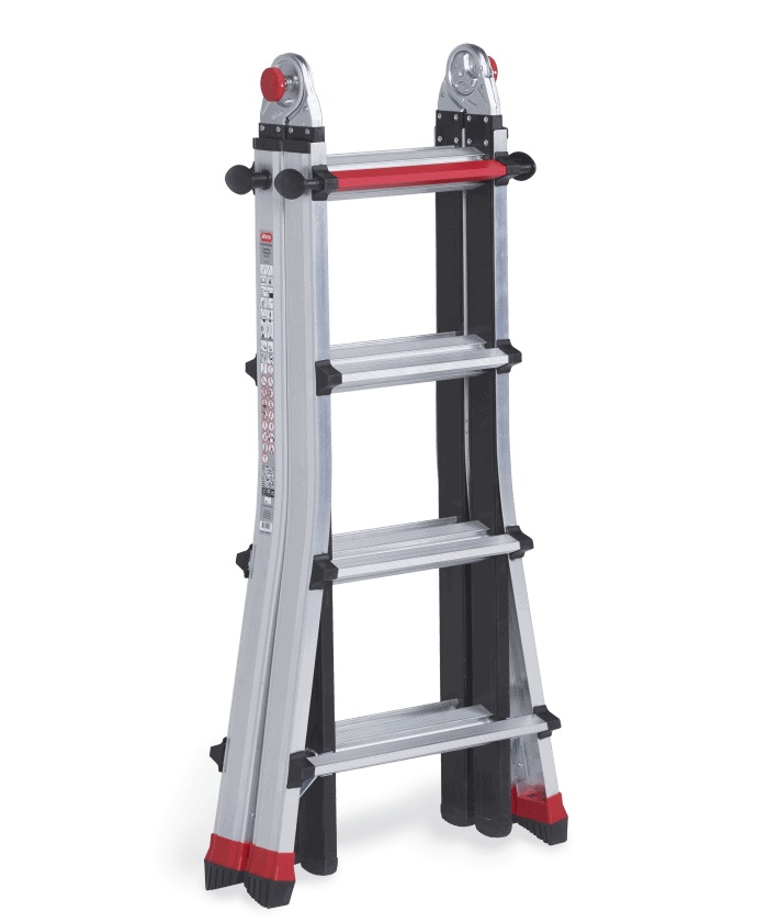Deze telescopische vouwladder met verstelbare voeten kan multifunctioneel gebruikt worden. Zo kan deze in de A-stand, ladderstand, platformstand en muurafhouderstand geplaatst worden. Ideaal voor het werk in trapopgangen of ongelijke ondergronden.